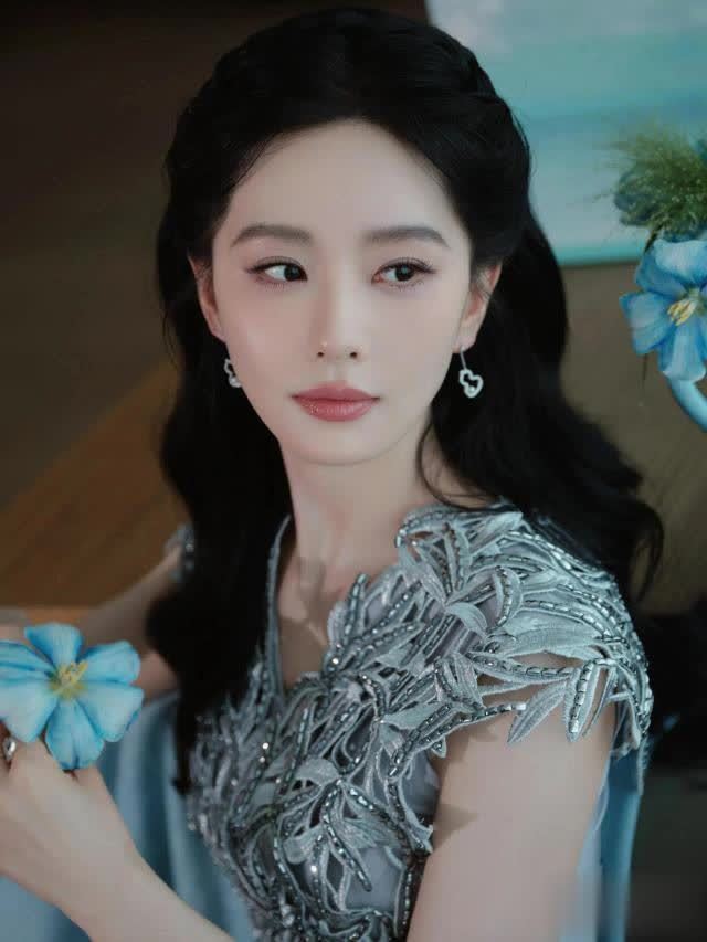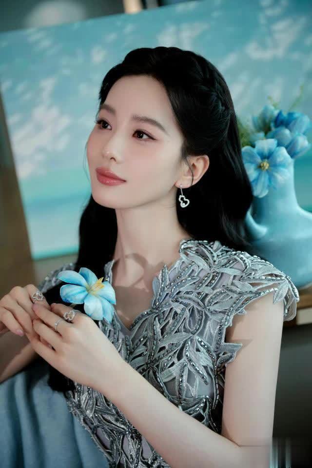 她的妆容淡雅而精致,眉毛细长而弯曲,眼睛明亮而有神,嘴唇微微上扬,露出自然的微笑。耳饰的设计简约而不失时尚感,与她的整体造型完美搭配。手中的蓝色花朵,细节清晰可见,仿佛在诉说着一个关于美丽与时尚的故事。这两张特写照片,让我们看到了刘诗诗每一个细节的完美,从妆容到服饰,再到手中的花朵,每一处都经过精心设计。