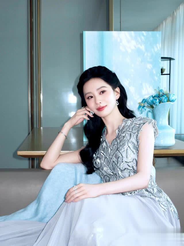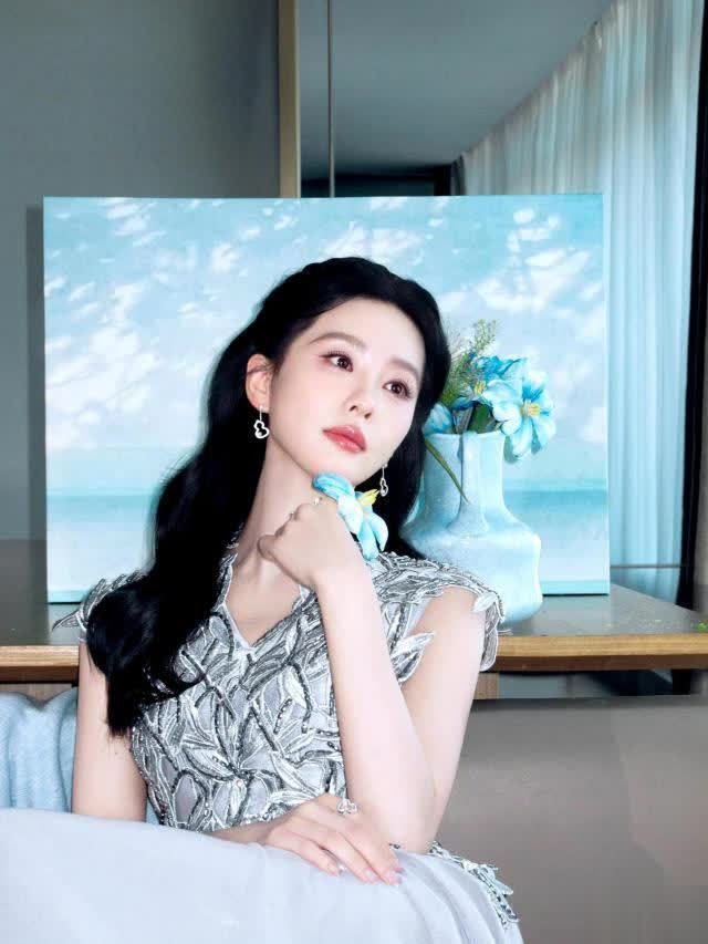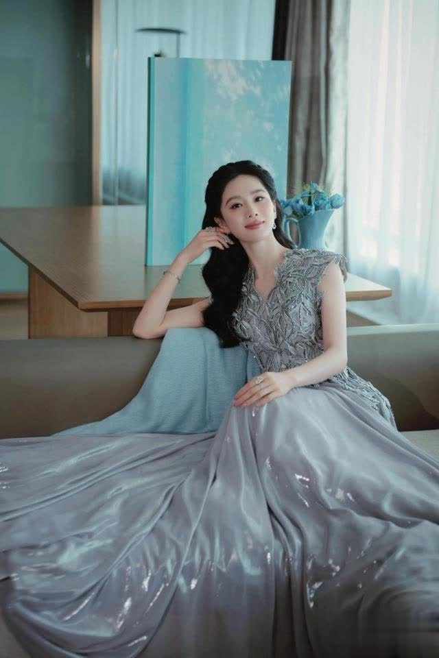 刘诗诗优雅地坐在沙发上,手轻轻托着脸颊,眼神中透露出温柔与自信。她身着一袭银灰色的礼服,上半部分精致的花纹刺绣,仿佛是夜空中闪烁的繁星,细腻而璀璨。礼服的材质在灯光下微微泛着光泽,与她身后浅蓝色的装饰画和花瓶中的蓝花相互呼应,营造出一种宁静而优雅的氛围。这一身穿搭,不仅凸显了她的高贵气质,更展现了她对时尚细节的极致追求。