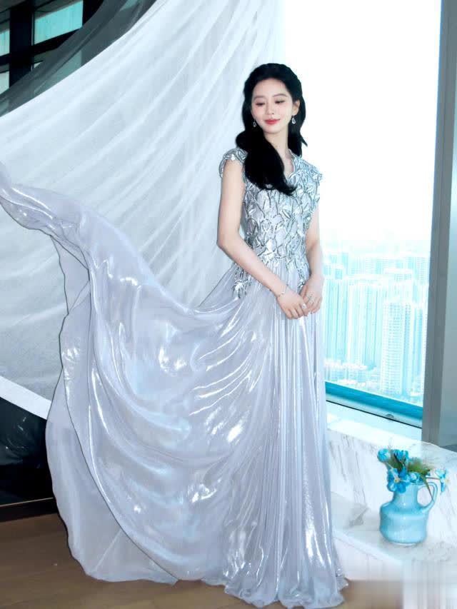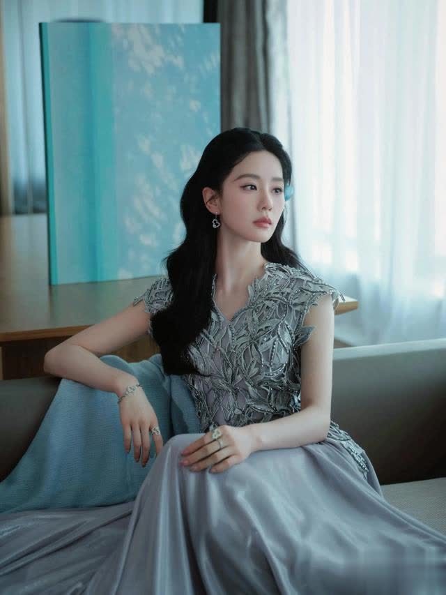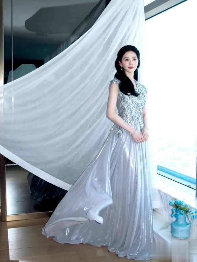 她的双手轻轻交叠放在身前,姿态优雅。窗外的城市景色与室内的装饰形成对比,而她则是这画面中最亮丽的风景。银灰色的礼服在窗边的光线照射下,呈现出不同的光泽,从浅灰到银白,层次丰富。这一张照片,将刘诗诗的大气与优雅展现得淋漓尽致。