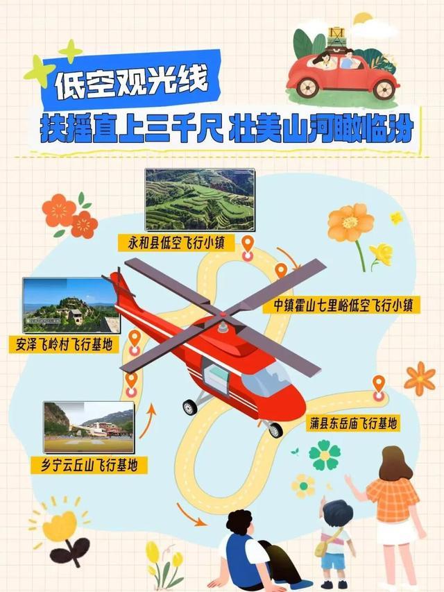 乡宁云丘山飞行基地、安泽飞岭村飞行基地、永和县低空飞行小镇、中镇霍山七里峪低空飞行小镇、蒲县东岳庙飞行基地
